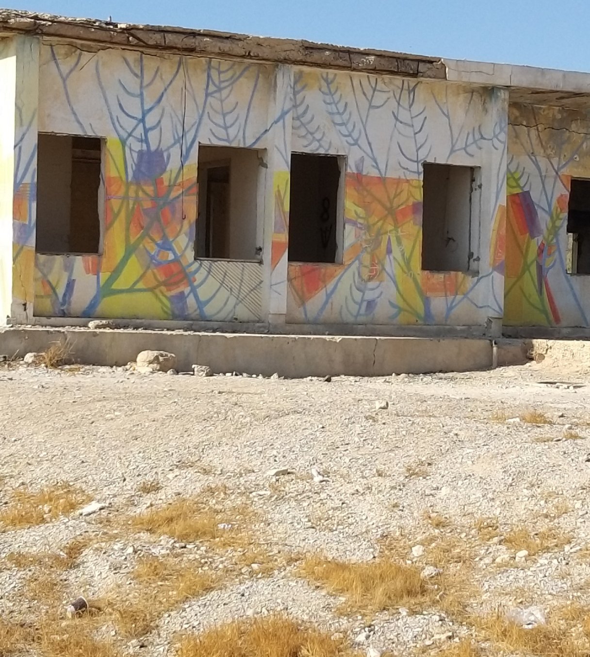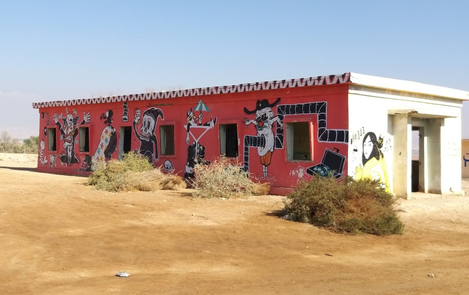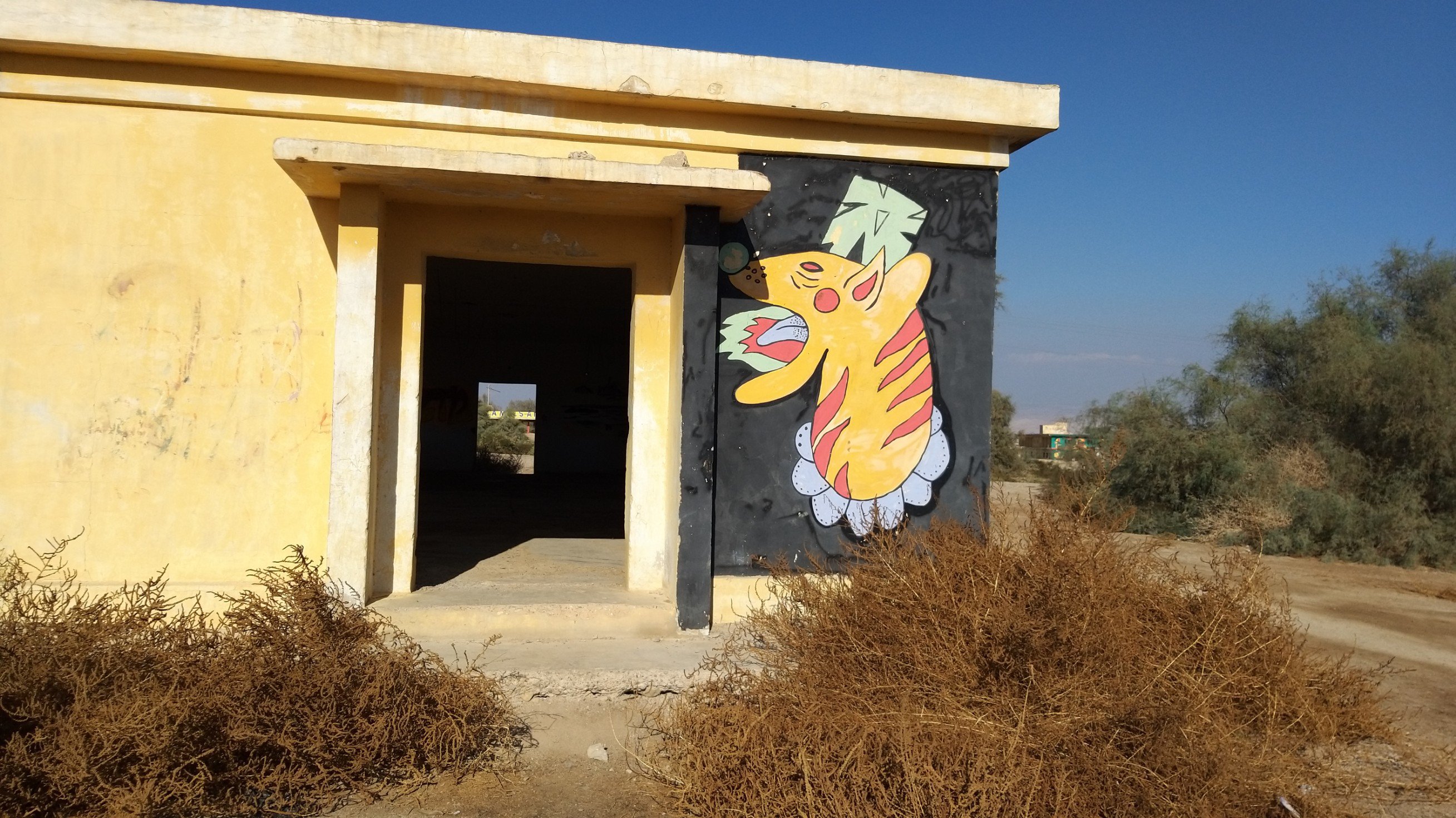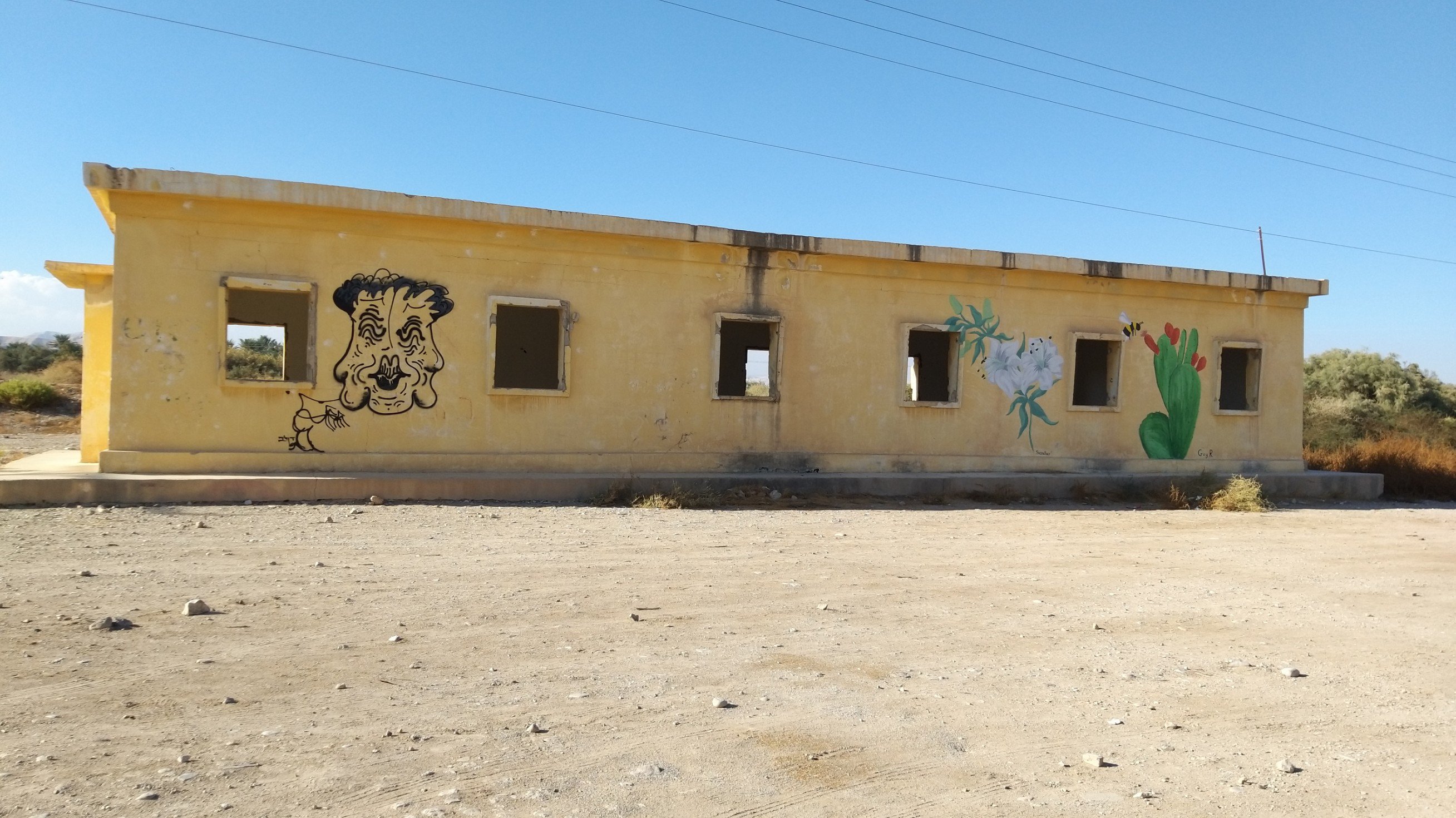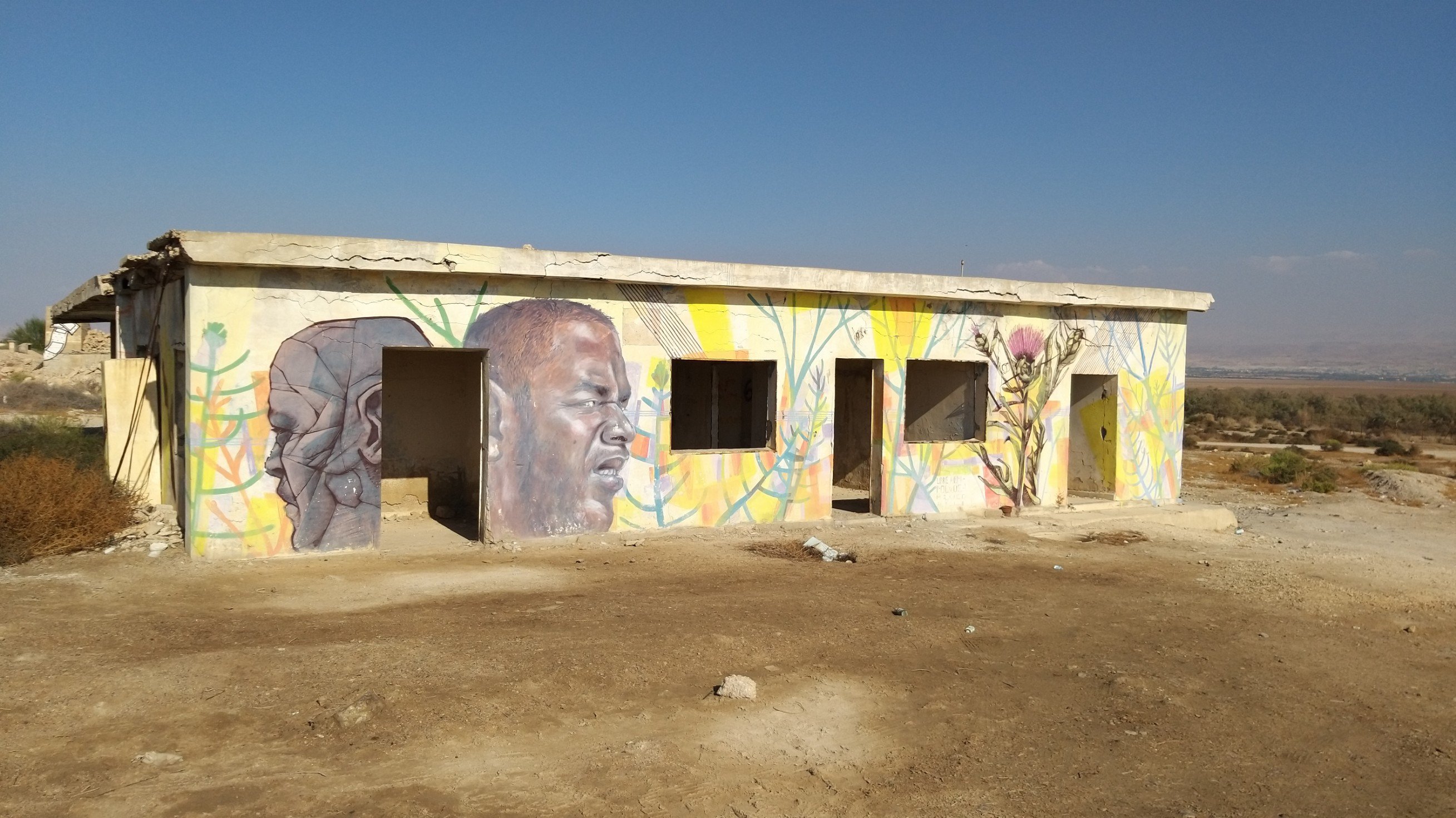 Last weekend my partner and I went to the Dead Sea for a short vacation. On our way back, he spontaneously asked me if I would like to see the paintings in “those old buildings near Kalia Beach” (at the northern end of the Dead Sea). Of course I did! I hadn’t even known about this project.